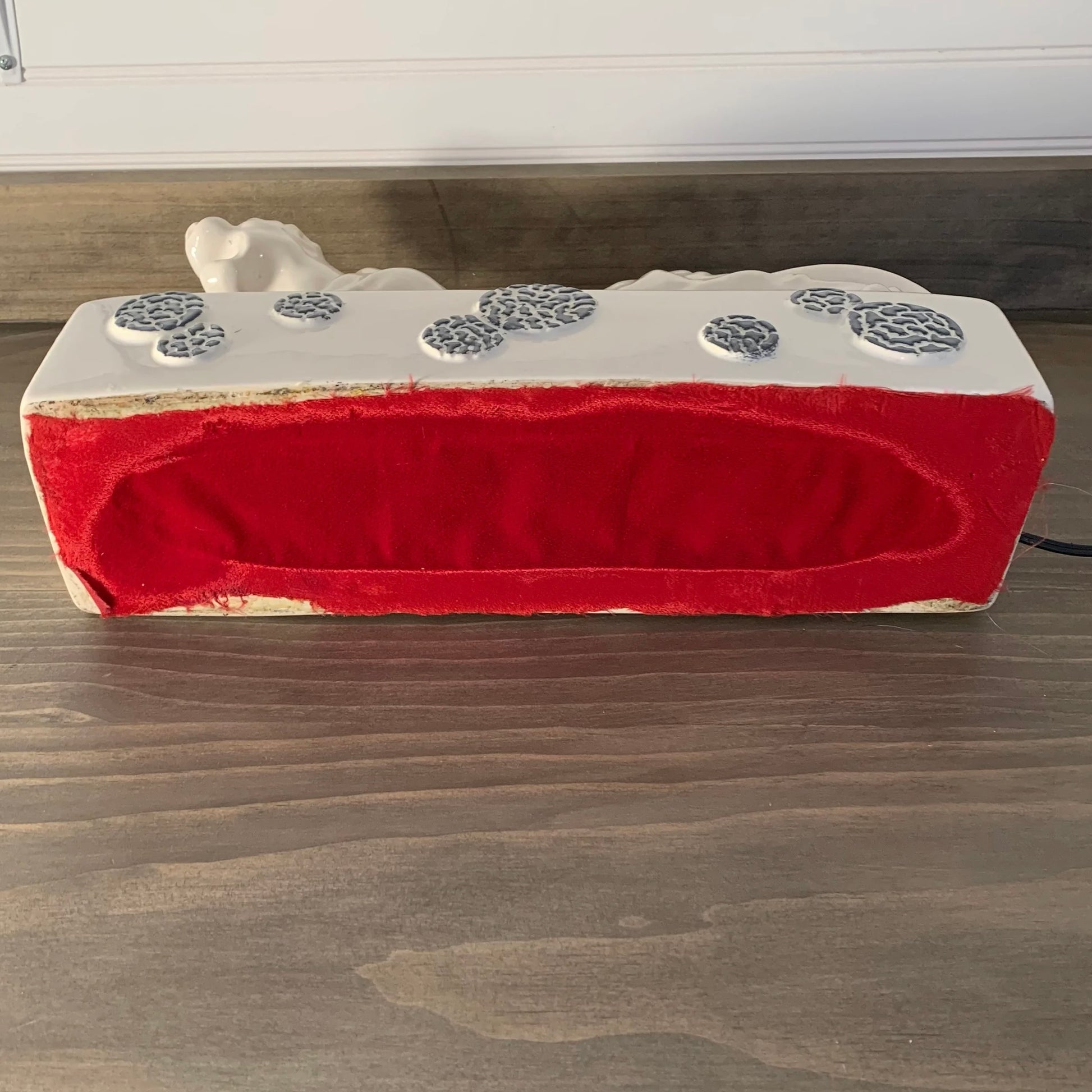White ceramic "Panther" TV lamp signed "Kron" in 1955. Lamp features a large white panther on top of a midcentury style base with white/grey accents. Lamps were an accent lamp designed to help eliminate eye strain associated with watching early low luminosity TVs. Now, beautifully designed lamps work great as a decorative table lamp A stunning collector’s piece!