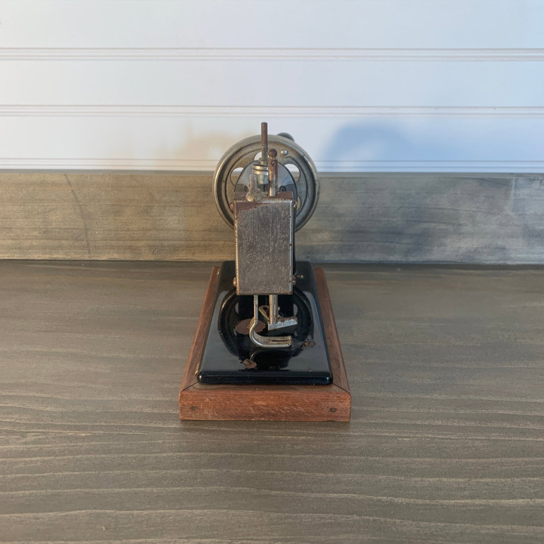 Vintage American Girl Child’s manual Black Sewing Machine. Approximately 6 inches tall and 7.5 inches long. All the levers and mechanisms turn freely when the crank is turned. Has some wear in the paint (see pics) overall nice “used” condition. A great collectors piece. |